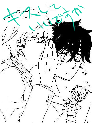 The detective frowned. He enjoyed the attention very much, of course, and he was hard-pressed to ignore a kiss from a Kaitou, but… Hakuba sighed and put his hands on Kaitou’s shoulder, gently bracing so that distance would be maintained when he stepped back.